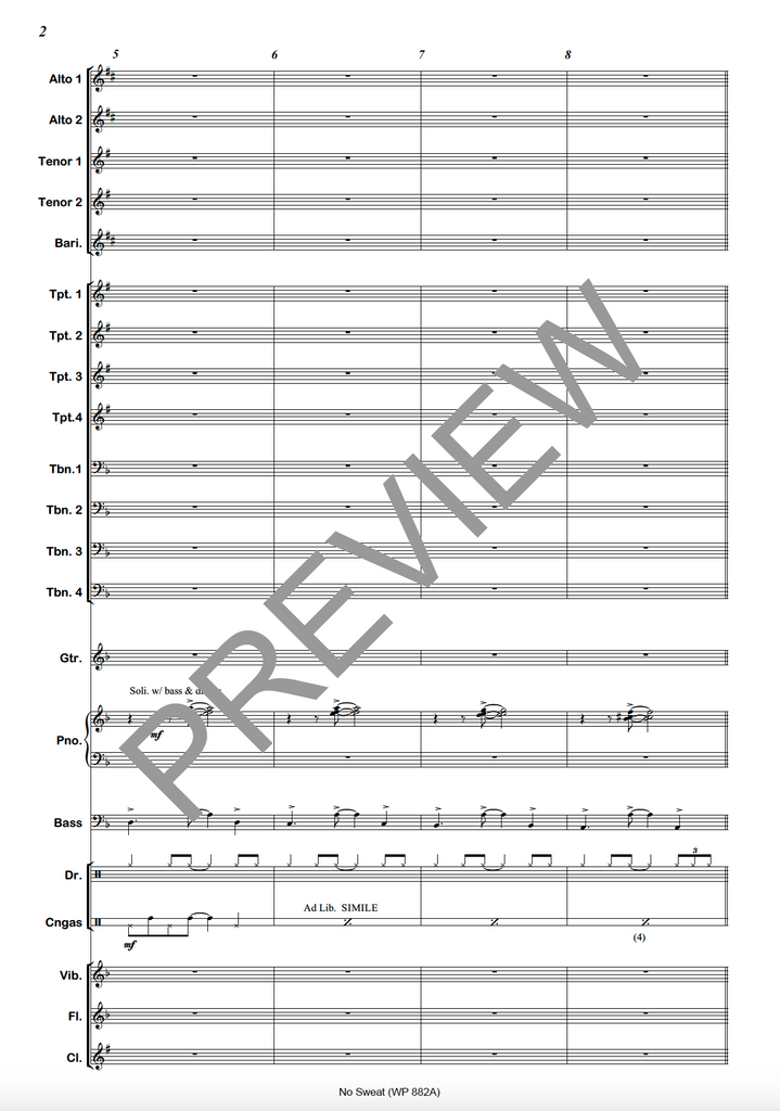 "No Sweat" is a great-sounding swing groove chart with a feature spot for your alto saxophonist (written or ad. lib.).